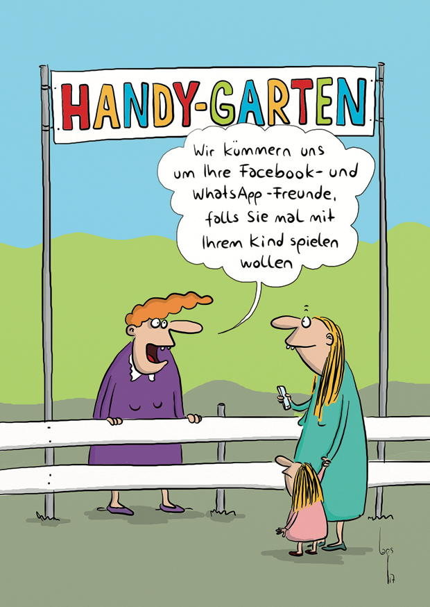 Zwei Eltern stehen am Handy-Garten, einer Spielzone für Kinder. Sie bieten an, sich um die Handys zu kümmern, während die Kinder spielen und Spaß haben.