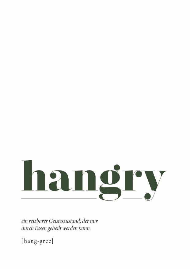 Der Text beschreibt den Zustand 'hangry', der entsteht, wenn Hunger und Gereiztheit miteinander vermischt sind. Er erläutert, dass Essen die Lösung ist.