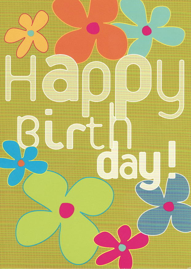 Diese Geburtstagskarte zeigt ein helles, fröhliches Design mit bunten Blumen auf grünem Hintergrund und der Aufschrift Happy Birthday.