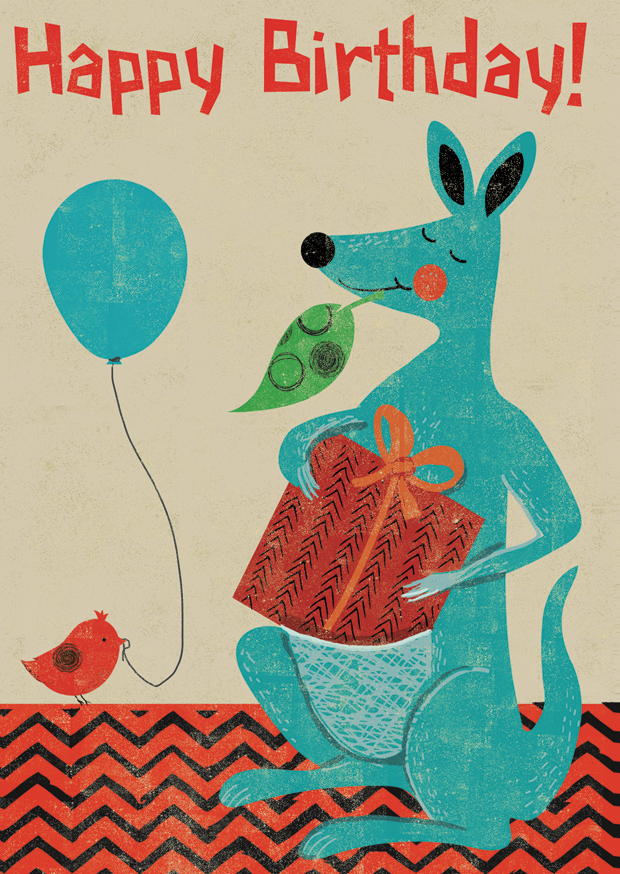 Ein Känguru sitzt zufrieden mit einem Geschenk in den Händen, während ein kleiner Vogel neben ihm steht. Über ihnen schwebt ein Luftballon.