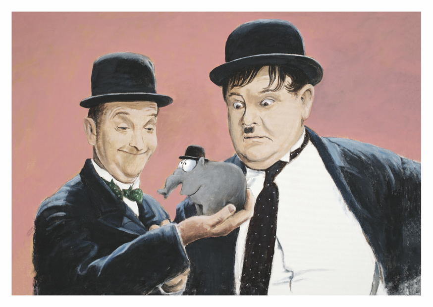 Zwei Männer in Anzug und Hut stehen nebeneinander. Einer lächelt und hält einen kleinen Elefanten in der Hand, während der andere überrascht schaut.