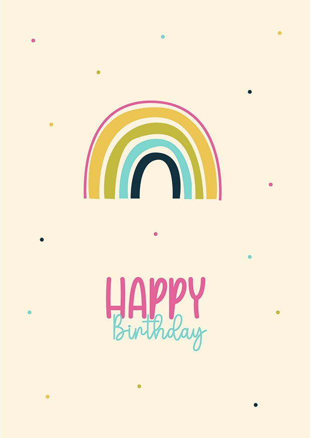 Diese Geburtstagskarte zeigt einen farbenfrohen Regenbogen und die aufmunternde Botschaft „Happy Birthday“ in verspielter Schrift. Ideal zum Verschenken.