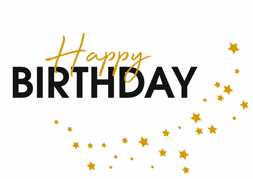 Eine festliche Geburtstagsbotschaft in schwarzer und goldener Schrift, umgeben von funkelnden Sternen, sorgt für eine fröhliche Atmosphäre.