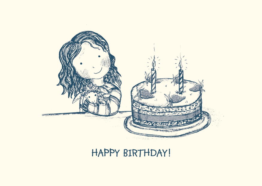 Ein kleines Mädchen sitzt mit einem Plüschtier in den Armen an einem Tisch, vor einer bunten Geburtstagstorte mit brennenden Kerzen. Sie strahlt vor Freude.