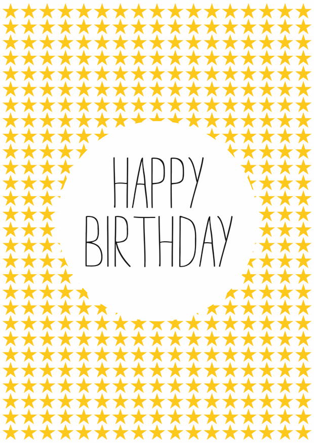 Diese Geburtstagskarte zeigt einen einfachen, aber festlichen Hintergrund aus goldenen Sternen, mit dem freundlichen Text Glücklicher Geburtstag in der Mitte.