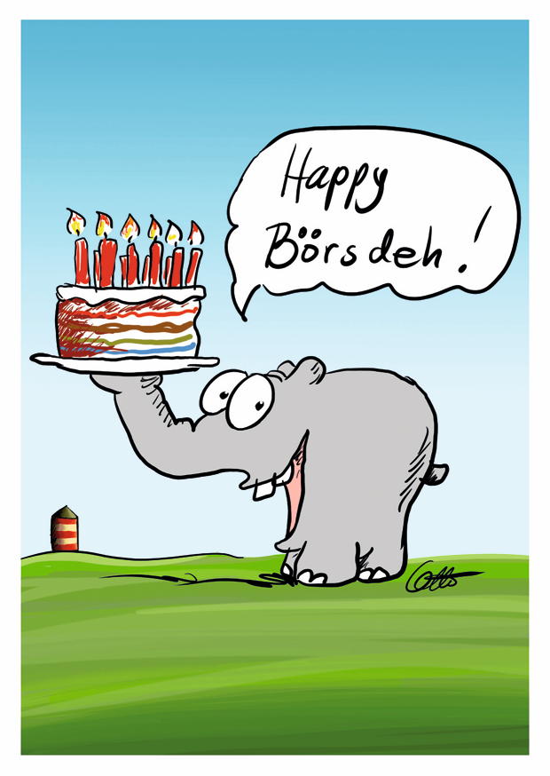 Ein fröhlicher Elefant hält eine bunte Geburtstagstorte mit vielen Kerzen in der Luft. Er steht auf einer grünen Wiese unter einem blauen Himmel und lächelt glücklich.