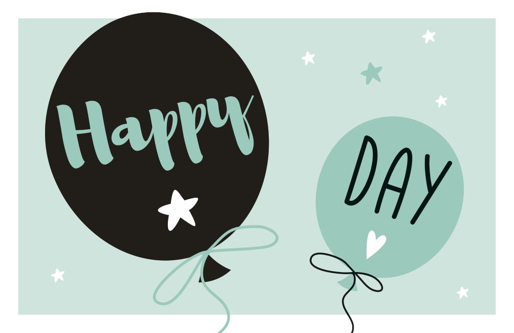 Zwei stilisierte Ballons in Schwarz und Mintgrün zeigen die Worte Happy Day. Die Gestaltung ist kindlich und frisch, ideal für Feierlichkeiten und besondere Anlässe.