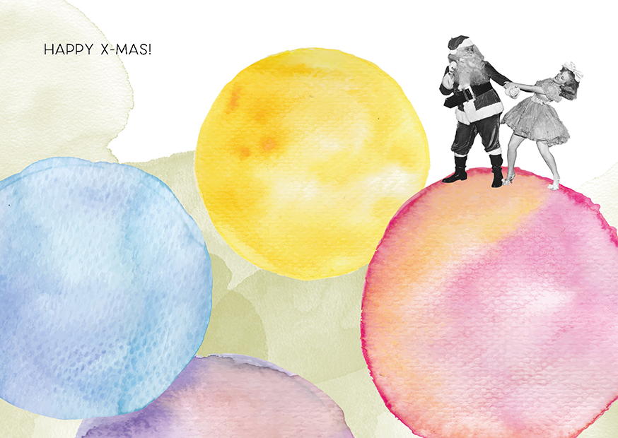 Santa hält ein Kind an der Hand und steht auf zwei farbenfrohen Kreisen, die Freude und festliche Stimmung verbreiten. Perfekt für die Weihnachtszeit!