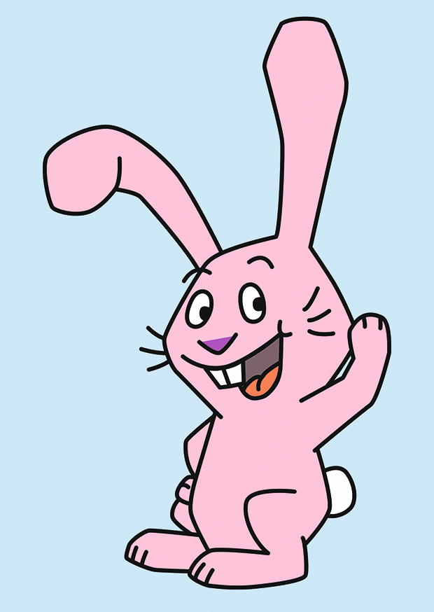 Der rosa Hase steht aufrecht und winkt mit einer seiner Pfoten. Sein breites Lächeln und die großen Ohren verleihen ihm eine lebhafte, freundliche Ausstrahlung.