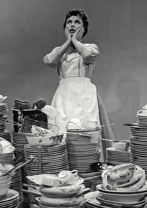 In einer hektischen Küchensituation sieht eine Frau verzweifelt aus, während sie von einem hohen Stapel schmutziger Geschirr umgeben ist. Die 1950er Jahre bringen nostalgische Erinnerungen.