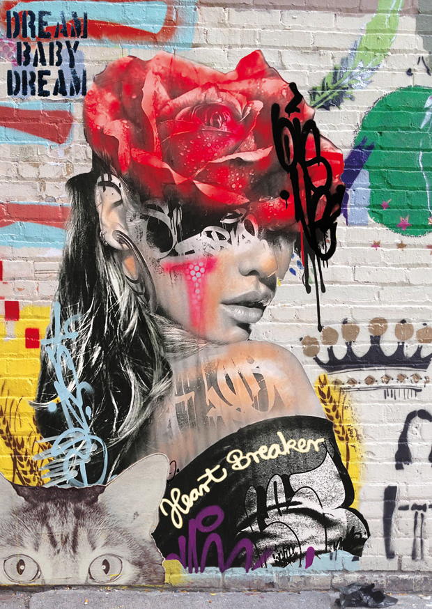 Auf einer Ziegelwand ist eine lebendige Wandmalerei zu sehen, die eine Frau mit einer roten Rose auf dem Kopf zeigt. Diese kreative Kunstinstallation wirkt dynamisch und modern.