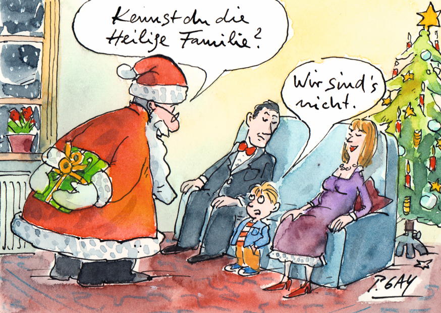 Der Weihnachtsmann steht in einem festlich geschmückten Wohnzimmer und spricht mit einem Kind und seinen Eltern. Das Kind fragt nach der Heiligen Familie, während die Eltern überrascht reagieren.