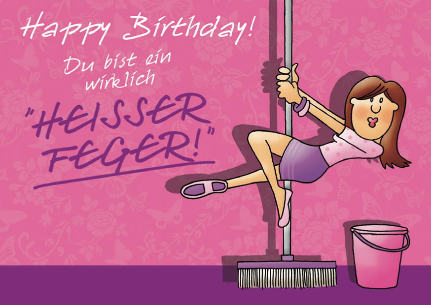 Eine bunte Geburtstagskarte zeigt eine Figur, die fröhlich an einem Besen lehnt und die Stimmung mit einem witzigen Spruch auflockert.