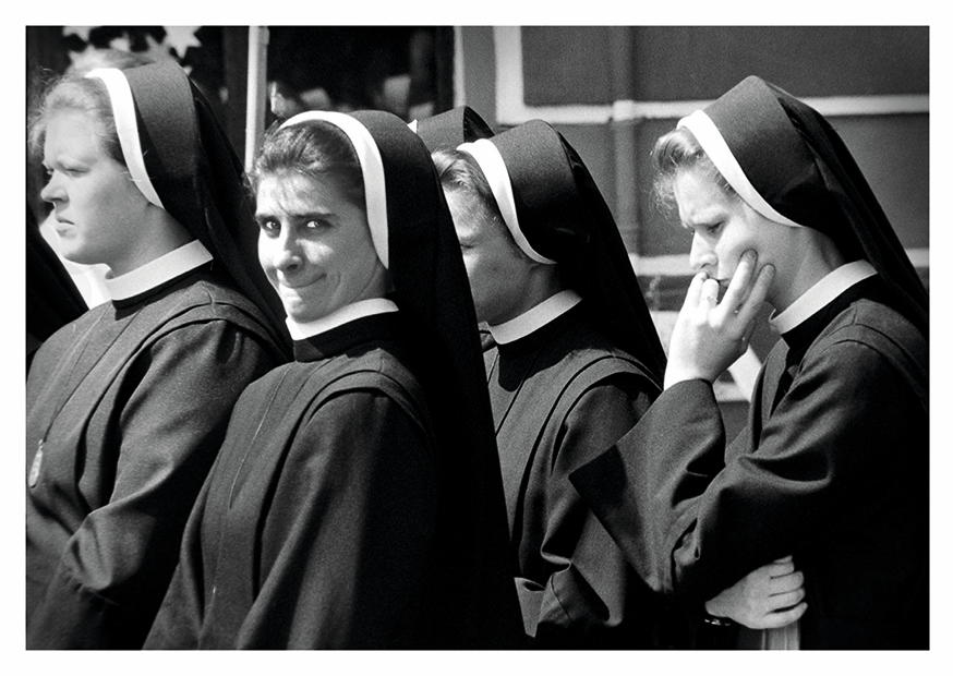 Fünf Nonnen in schwarzer Tracht stehen in einer Reihe. Eine von ihnen lächelt leicht, während die anderen ernst wirken. Es ist ein sonniger Tag.