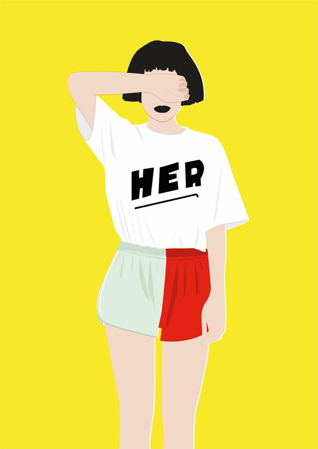 In dieser bunten Illustration steht ein Mädchen mit einem weißen Shirt und halb roten, halb weißen Shorts. Sie verdeckt mit einer Hand ihr Gesicht und steht vor einem leuchtend gelben Hintergrund.
