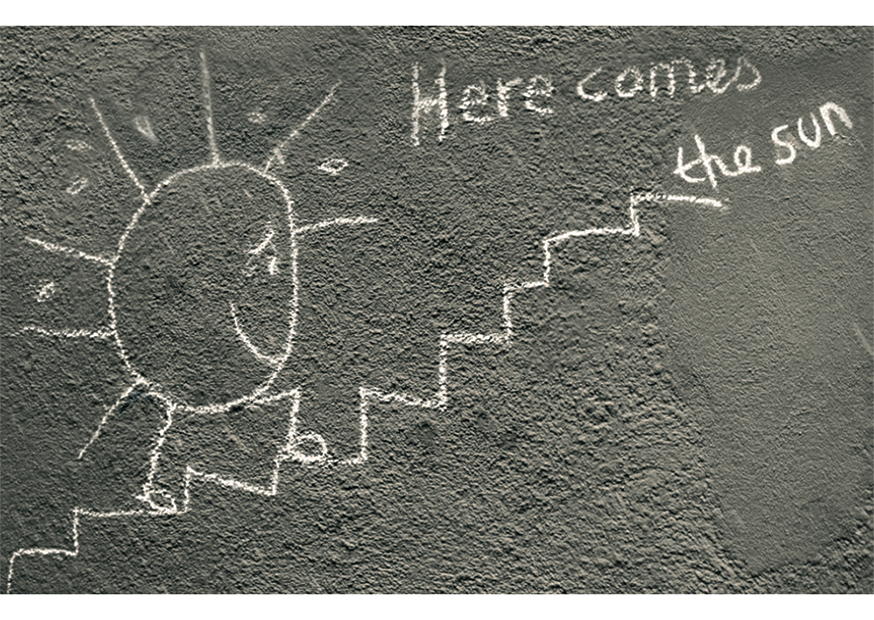 Eine kreative Wandmalerei zeigt eine lächelnde Sonne mit Strahlen und dem Schriftzug, der den Erscheinungszeitpunkt der Sonne ankündigt. Diese Kunst ist in einer städtischen Umgebung sichtbar.