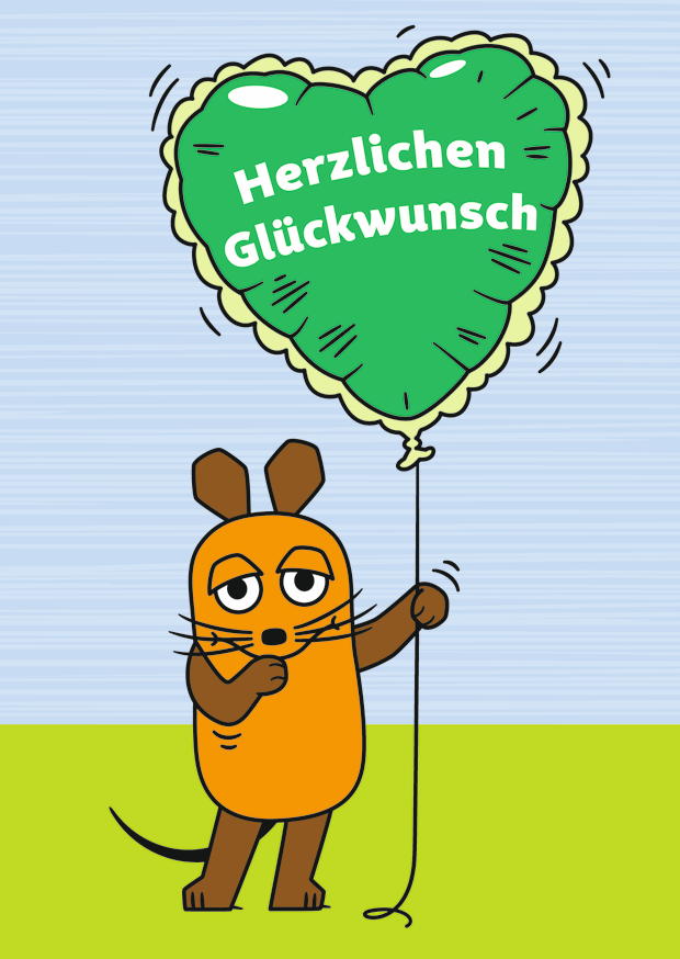 Die Maus steht auf einer grünen Wiese und hält einen großen Herzluftballon in der Luft, der den Text Herzlichen Glückwunsch zeigt, um Freude und Feiern auszudrücken.