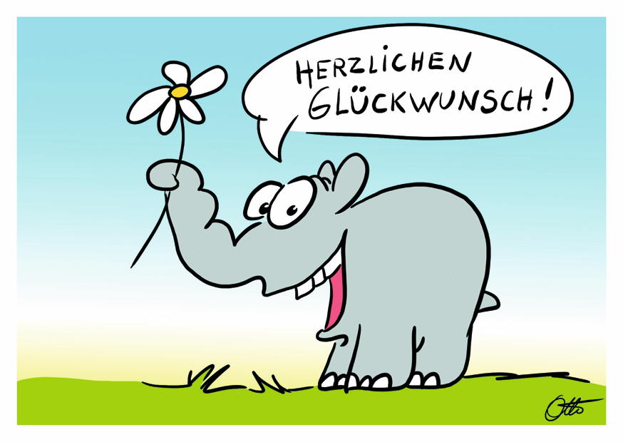 Ein fröhlicher Elefant steht auf einer Wiese, hält eine Blume und sagt „Herzlichen Glückwunsch!“. Der Himmel ist blau und die Stimmung ist heiter.