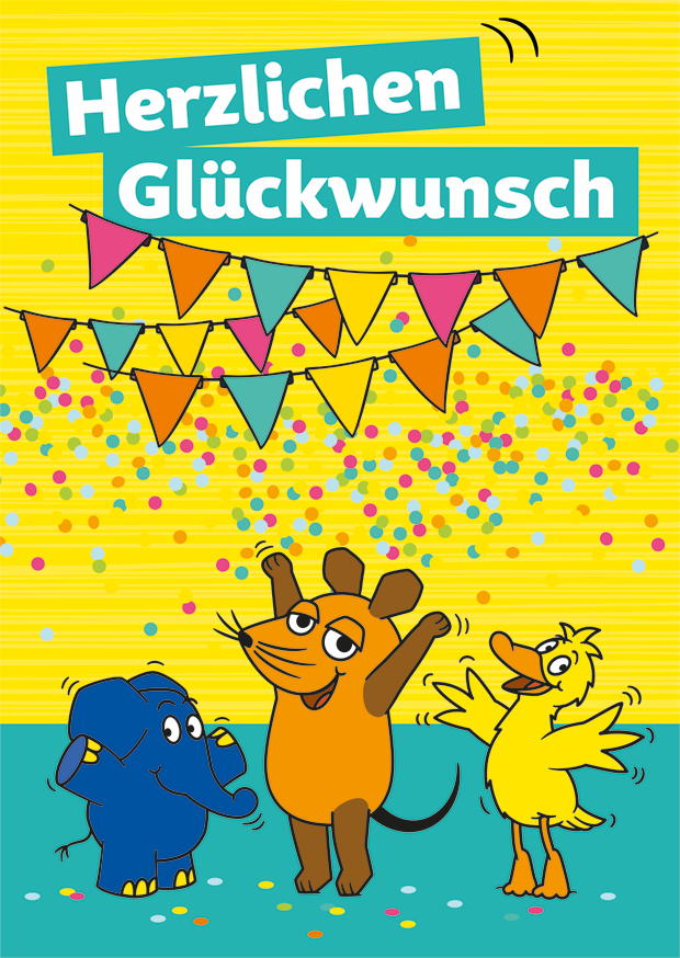 Drei cartoonhafte Tiere, ein Elefant, eine Maus und eine Ente, feiern auf einer bunten Hintergrundwand mit Wimpel und Konfetti. Die Stimmung ist ausgelassen und fröhlich.