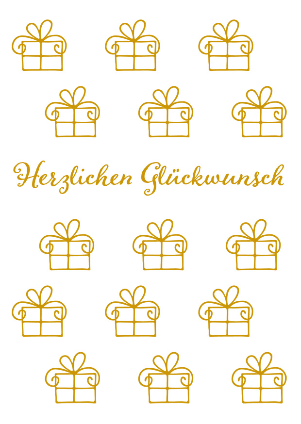 Das Motiv zeigt verschiedene Geschenke in stilvollem Gold, umgeben von Glückwünschen, ideal für Einladungen oder Glückwunschkarten zu besonderen Anlässen.