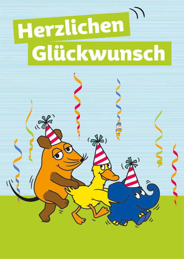 Drei Tiere mit Partyhüten, ein Maus und ein Elefant und eine Ente, tanzen fröhlich nebeneinander. Luftschlangen hängen von oben.