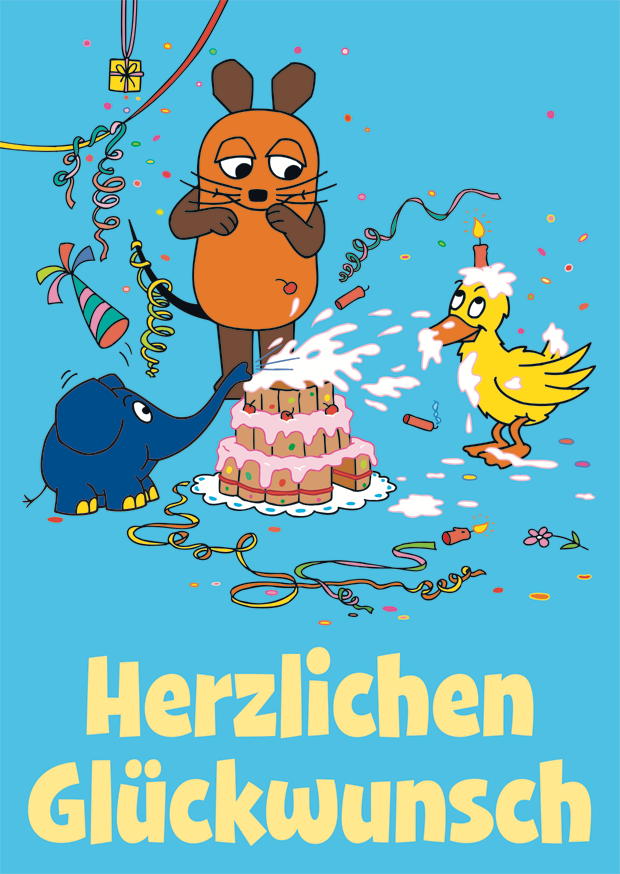 Maus, Elefant und Ente feiern einen Geburtstag mit einer bunten Torte, Konfetti und vielen Luftschlangen. Alle haben Spaß und Freude.