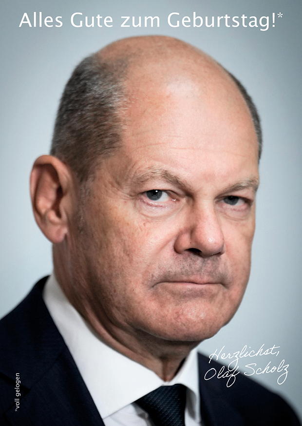 Der Bundeskanzler Olaf Scholz schaut ernst in die Kamera und sendet gratulierende Wünsche zum Geburtstag. Das Bild strahlt eine offizielle Atmosphäre aus.