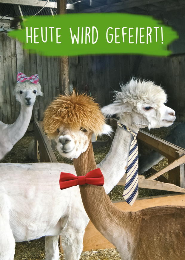 Drei Alpakas tragen kreative Accessoires wie Krawatten und Schleifen. Sie stehen in einem Stall und scheinen sich auf eine Feier vorzubereiten.
