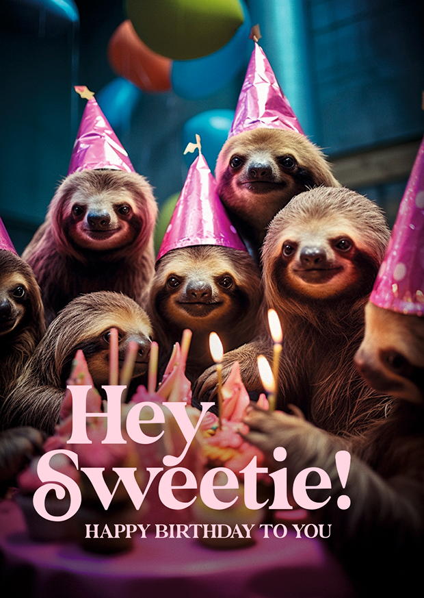 Eine fröhliche Ansammlung von Faultieren trägt Partyhütchen und versammelt sich um eine rosa Geburtstagstorte mit Kerzen. Die Atmosphäre ist festlich und bunt, perfekt für eine Feier.