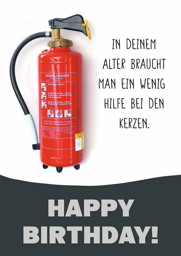 Ein roter Feuerlöscher wird symbolisch als Geburtstagsgeschenk präsentiert, mit humorvollem Hinweis auf die Bedürfnisse im Alter.