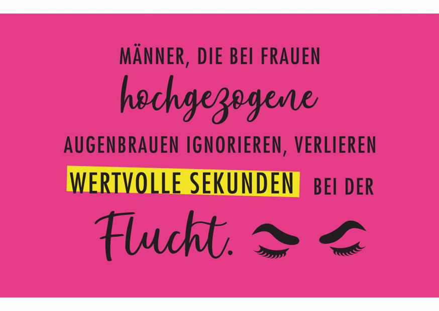 Ein humorvoller Spruch über Männer und Frauen, der darauf hinweist, dass Männer hochgezogene Augenbrauen bei Frauen ernst nehmen sollten, um Missverständnisse zu vermeiden.
