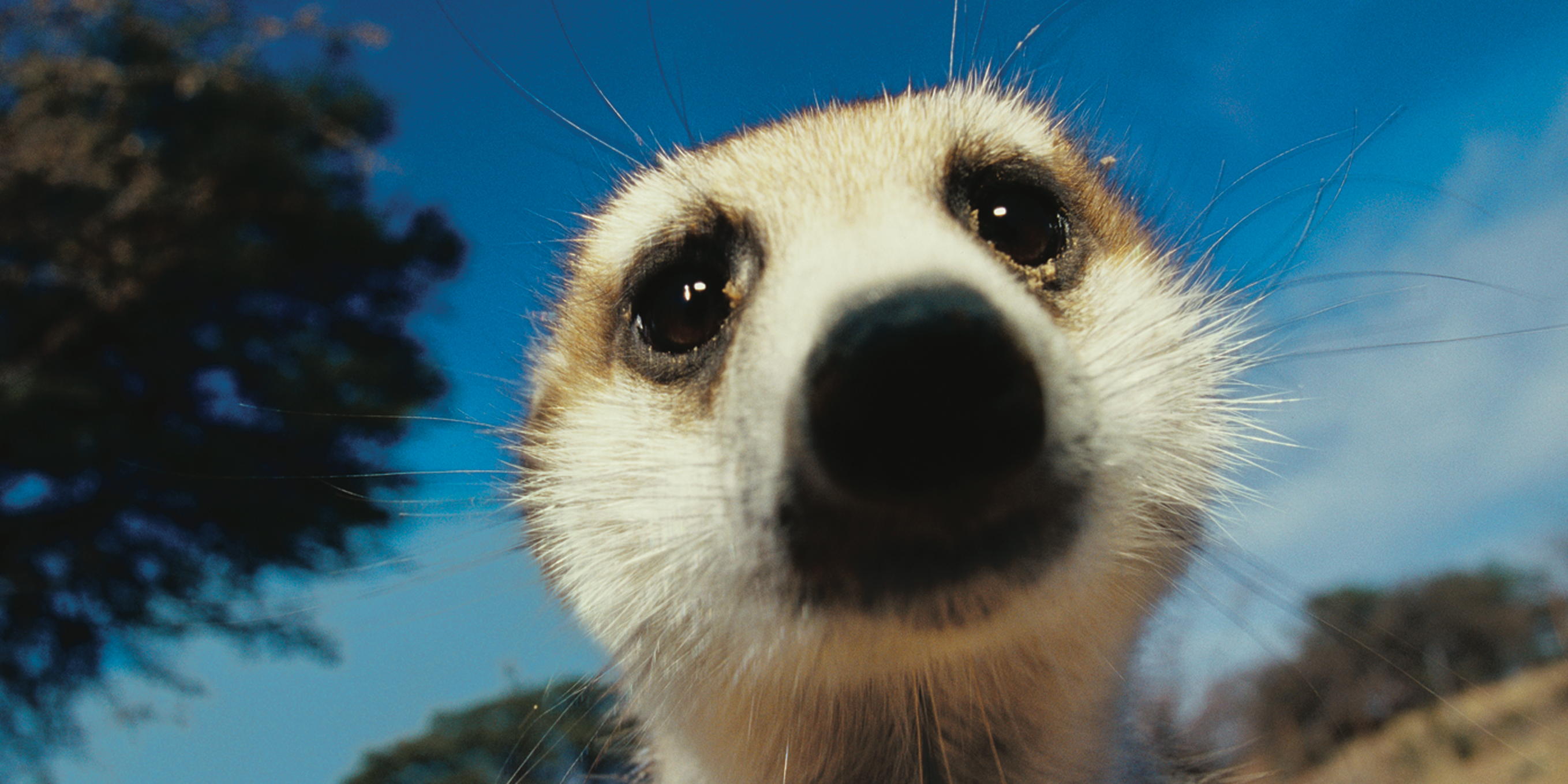 Ein Erdmännchen erkundet neugierig die Umgebung und blickt direkt in die Kamera. Es ist ein klarer, sonniger Tag in der afrikanischen Savanne.