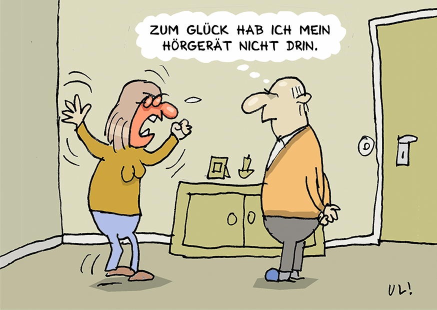In einem Wohnzimmer streiten sich eine Frau und ein Mann. Die Frau ist wütend und gestikuliert, während der Mann entspannt wirkt und stolz darauf ist, sein Hörgerät nicht zu tragen.