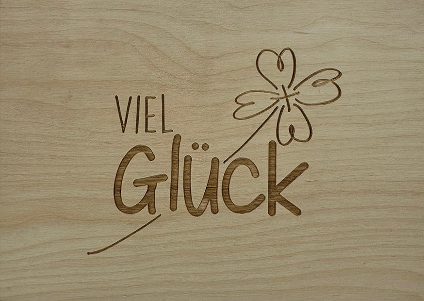 Auf einem hellen Holzhintergrund sind die Worte Viel Glück zusammen mit einem stilisierten Kleeblatt eingraviert. Ideal für besondere Anlässe.
