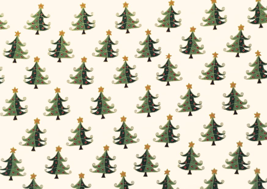 Auf hellem Hintergrund sind zahlreiche kleine Weihnachtsbäume zu sehen, die mit roten und goldenen Ornamenten für die festliche Jahreszeit geschmückt sind.