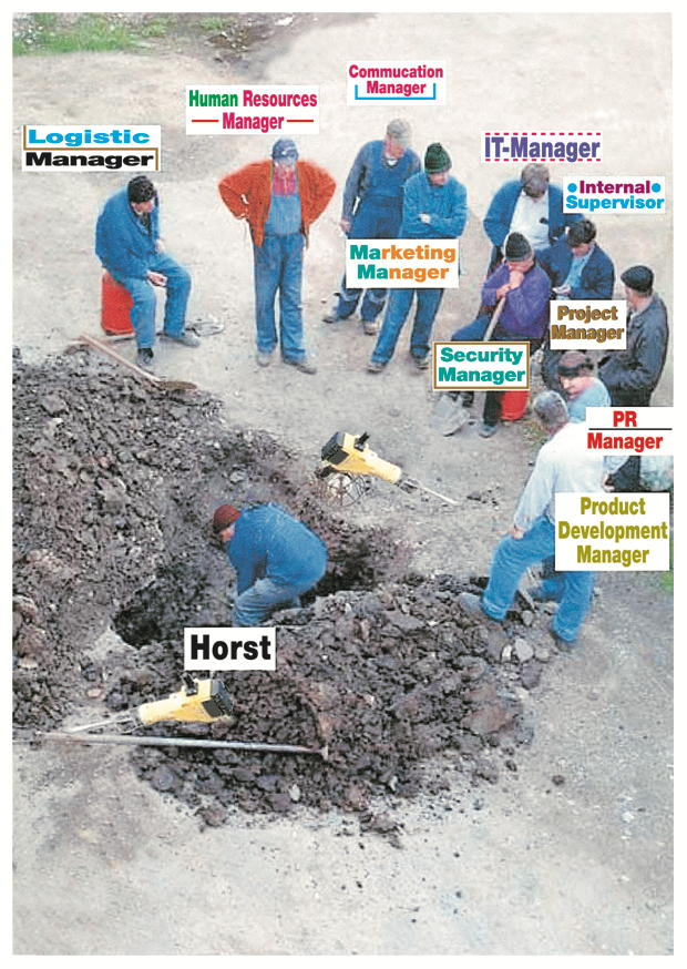 Eine Gruppe von Managern beobachtet einen Kollegen, der in einen Schacht gräbt, während sie sich im Freien versammeln, um über ein aktuelles Projekt zu diskutieren.