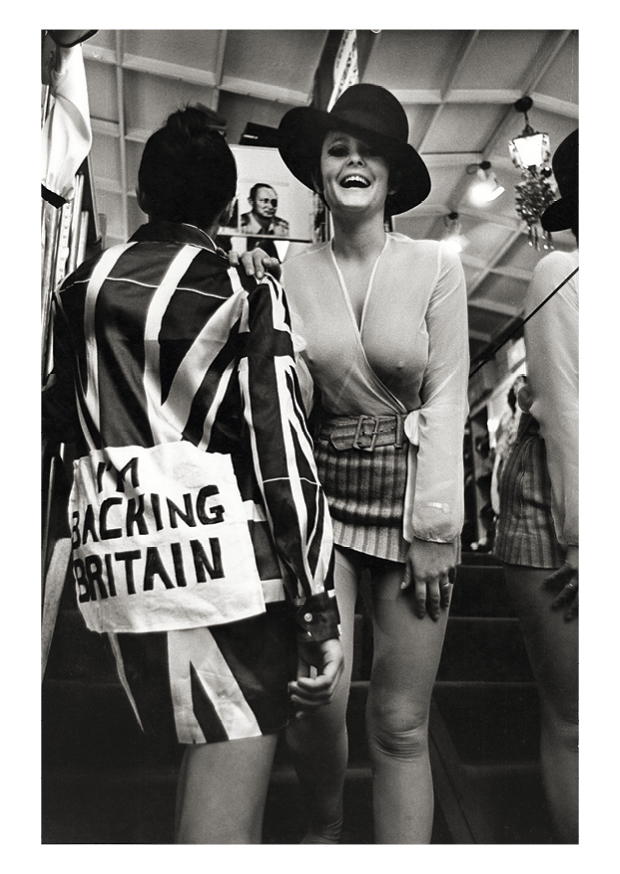 Die beiden Frauen tragen auffällige Kleidung mit verschiedenen Mustern und genießen die lebendige Atmosphäre einer Modeschau in den 1960er Jahren.