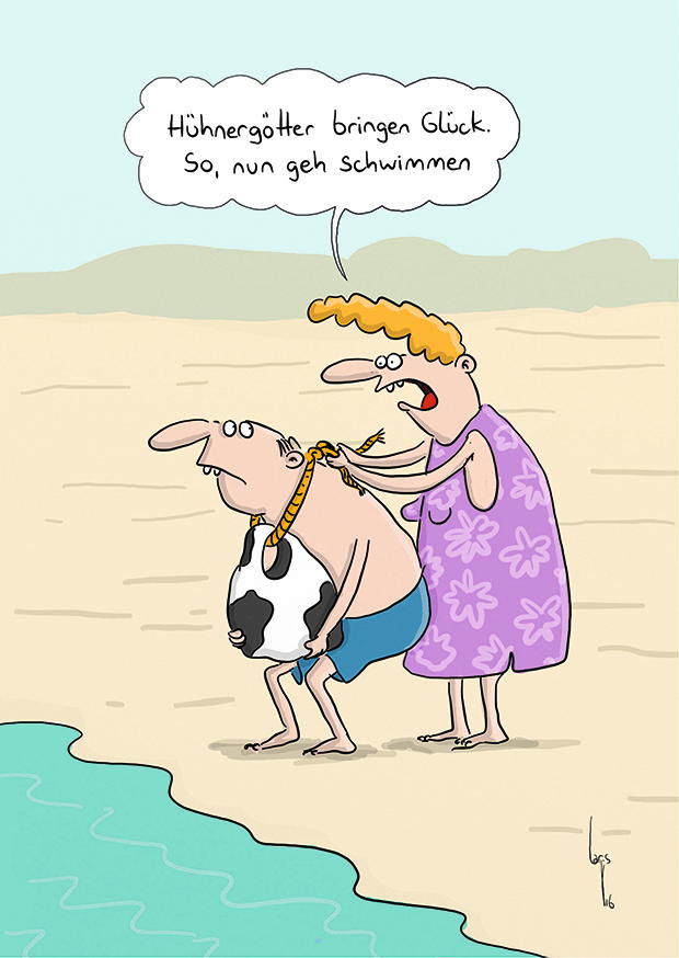 Ein Mann mit einer ungewöhnlichen Kuh-Halskette steht am Wasser, während eine Frau ihm ermutigend beim Schwimmen helfen will. Es herrscht eine lustige Stimmung.