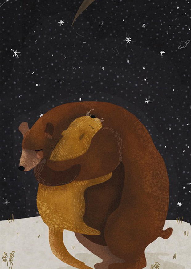 Zwei Tiere, ein großer Bär und ein kleines Tier, stehen friedlich in einer schneebedeckten Umgebung und umarmen sich liebevoll unter einem Sternenhimmel.