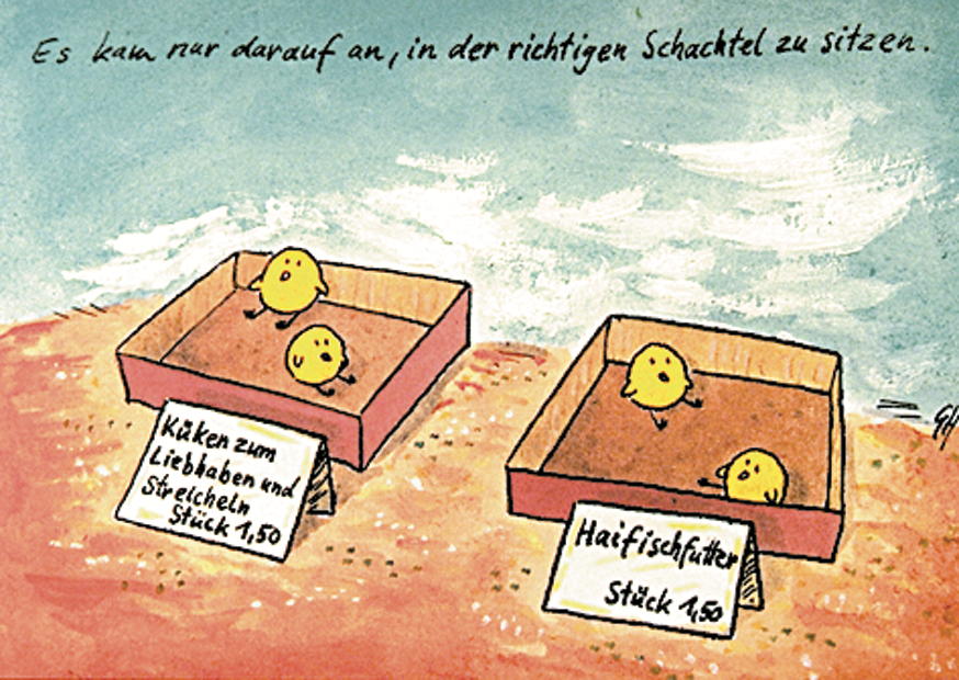 Am Strand stehen zwei Kisten, die jeweils ein Kücken und Haifischflossen zeigen. Die Kisten sind beschriftet, und der Preis wird angegeben.