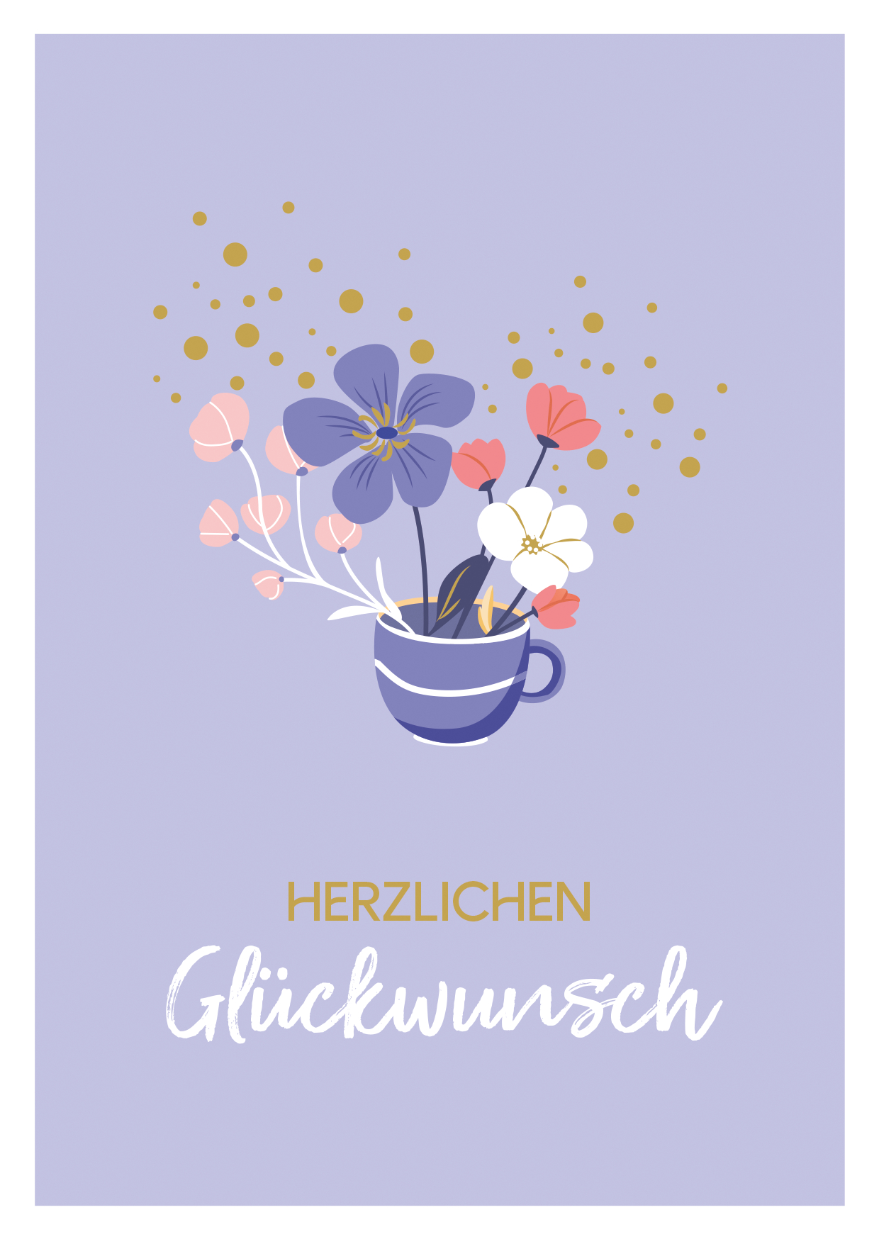 Die Karte zeigt einen blauen Becher voller farbenfroher Blumen und goldenen Punkten. Ideal, um Glückwünsche für verschiedene Anlässe auszudrücken.