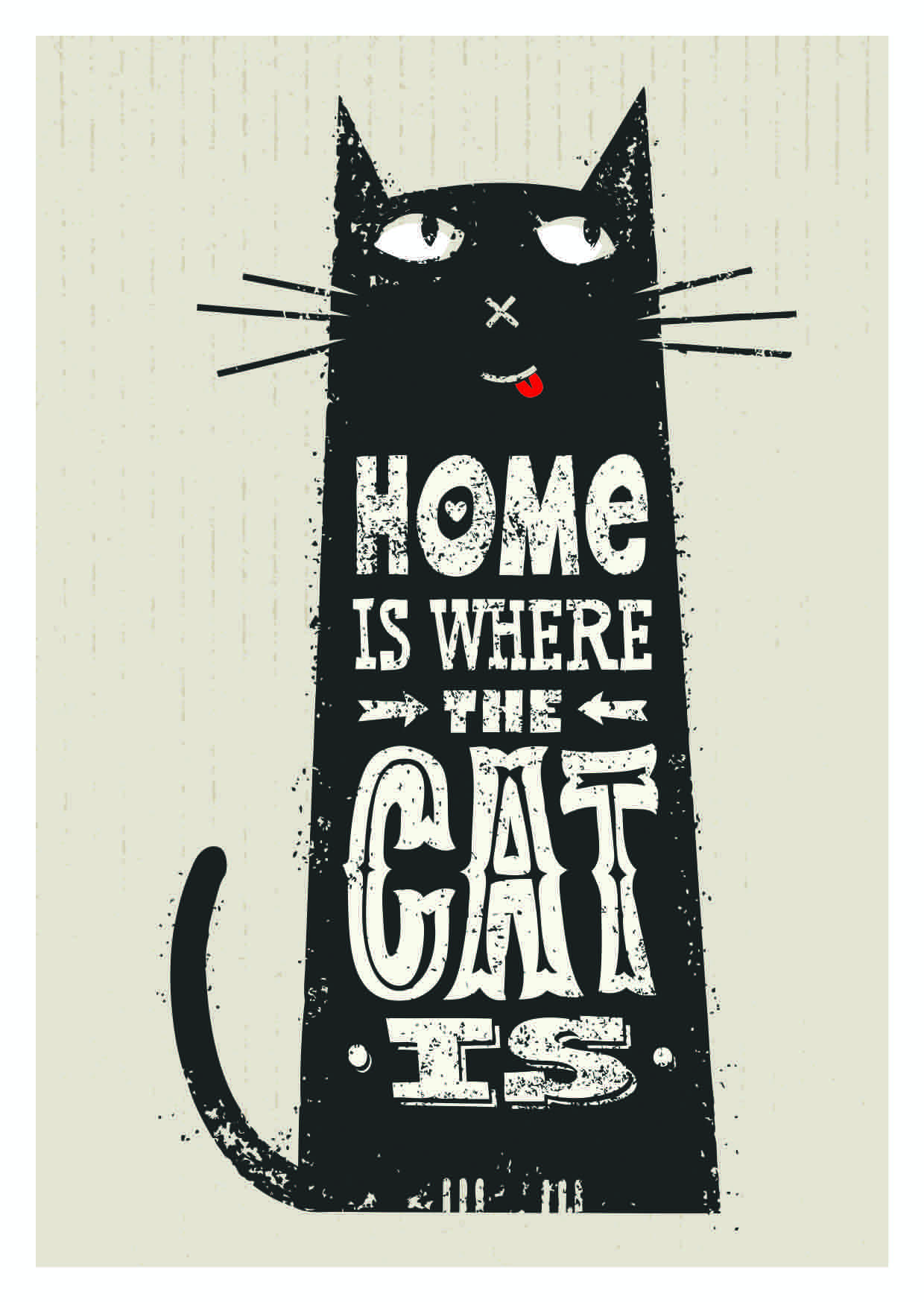 Ein stilisiertes Kunstwerk zeigt eine große schwarze Katze mit einem humorvollen Spruch über die Bedeutung des Zuhauses. Die Katze vermittelt ein Gefühl von Gemütlichkeit.
