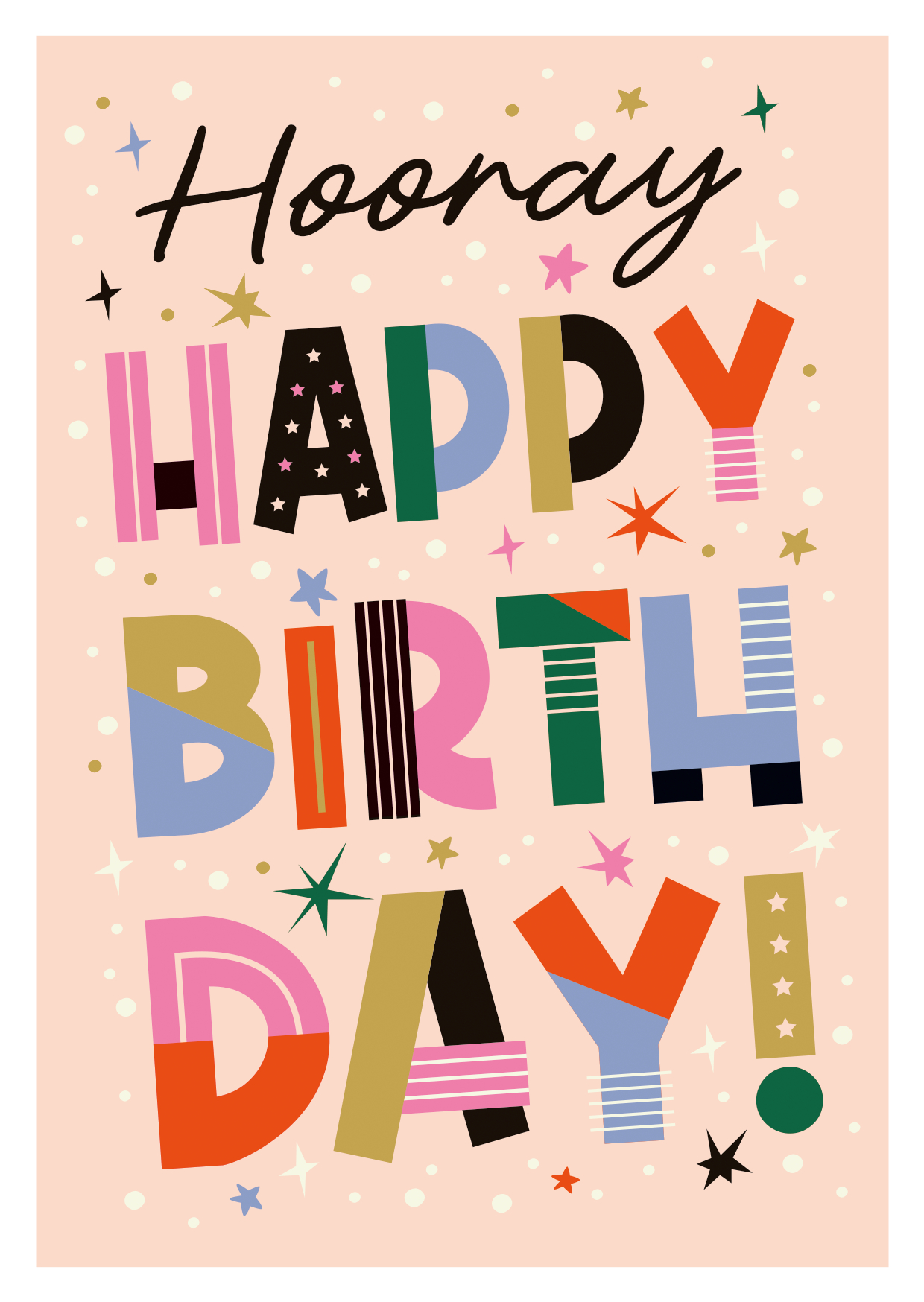 Eine farbenfrohe Geburtstagskarte zeigt fröhliche Buchstaben und Sterne. Sie vermittelt eine festliche Stimmung und eignet sich perfekt für Glückwünsche.
