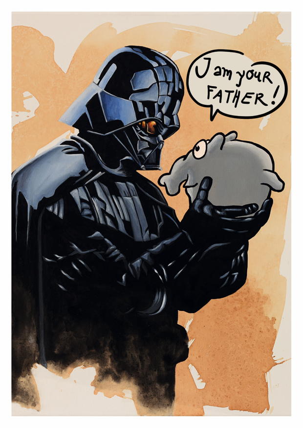 Darth Vader steht im Mittelpunkt und hält ein graues Kätzchen in seinen Händen. Mit einer charakteristischen Geste spricht er den berühmten Satz aus der Science-Fiction-Welt.