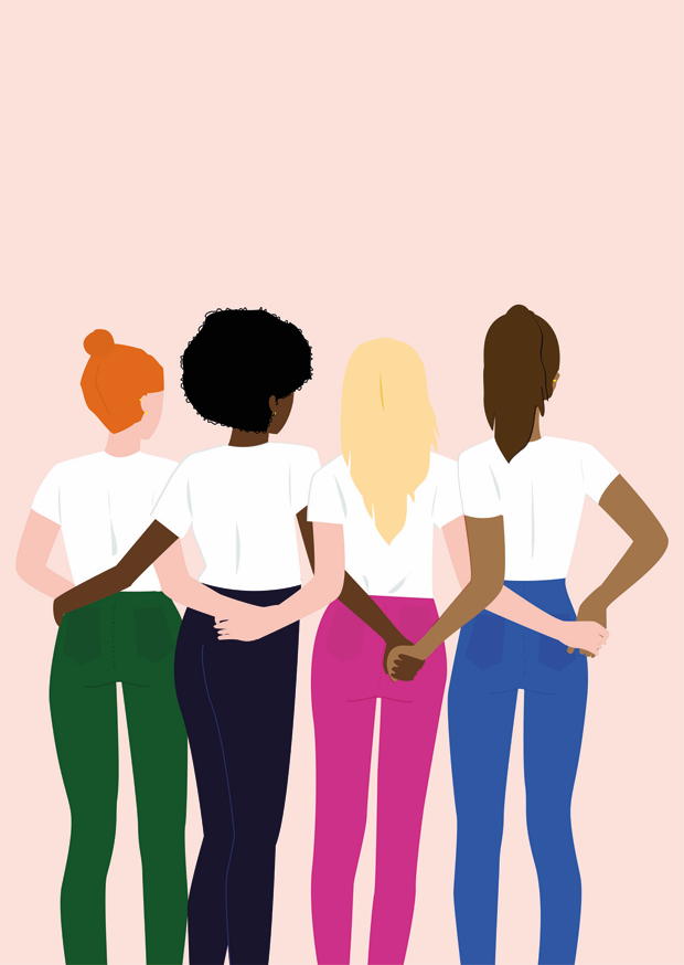 Vier Frauen in unterschiedlichen Haltungen stehen Rücken an Rücken, während sie in lässiger Mode verschiedene Farben tragen. Das Bild strahlt Freundschaft und Zusammenhalt aus.