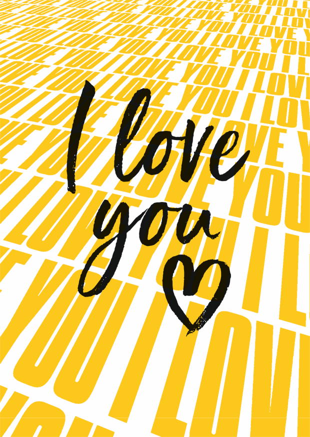 Ein leuchtend gelber Hintergrund zeigt mehrfach die Botschaft Ich liebe dich in verschiedenen Schriftarten. Klar und herzlich wird Liebe ausgedrückt.