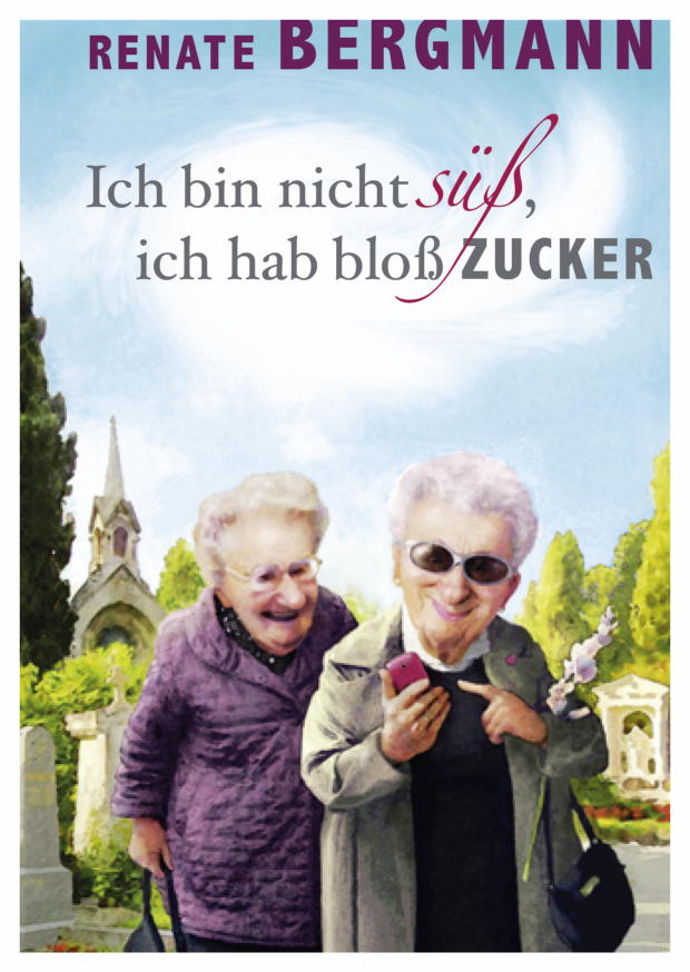 Auf dem Friedhof unterhalten sich zwei ältere Damen. Ihre fröhlichen Gesichter und der witzige Spruch über Zucker vermitteln eine heitere Stimmung in ihrer Umgebung.