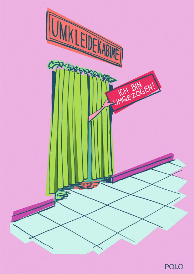 Eine Umkleidekabine mit grünen Vorhängen befindet sich in einem rosa Raum. Ein Schild verkündet humorvoll, dass die Kabine umgezogen ist.