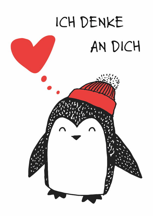 Der Pinguin trägt eine rote Mütze und denkt an eine geliebte Person, dargestellt durch ein Herz über seinem Kopf. Die Szene strahlt Wärme und Zuneigung aus.