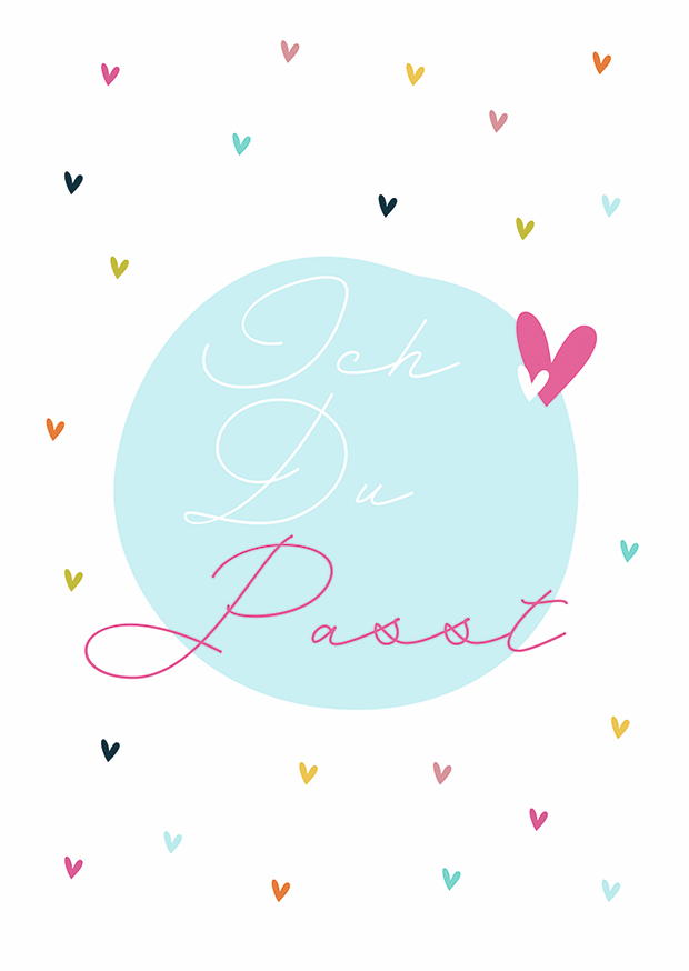 Das Design zeigt eine kreative Darstellung mit kleinen bunten Herzen auf einem hellblauen Hintergrund und einem liebevollen Schriftzug, perfekt für festliche Anlässe.